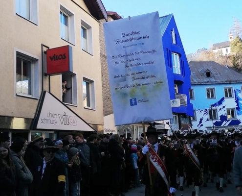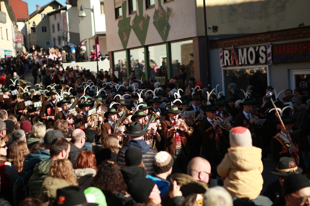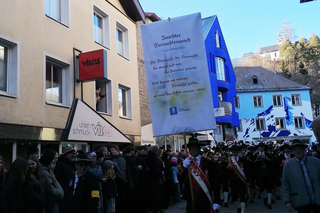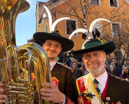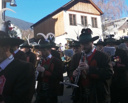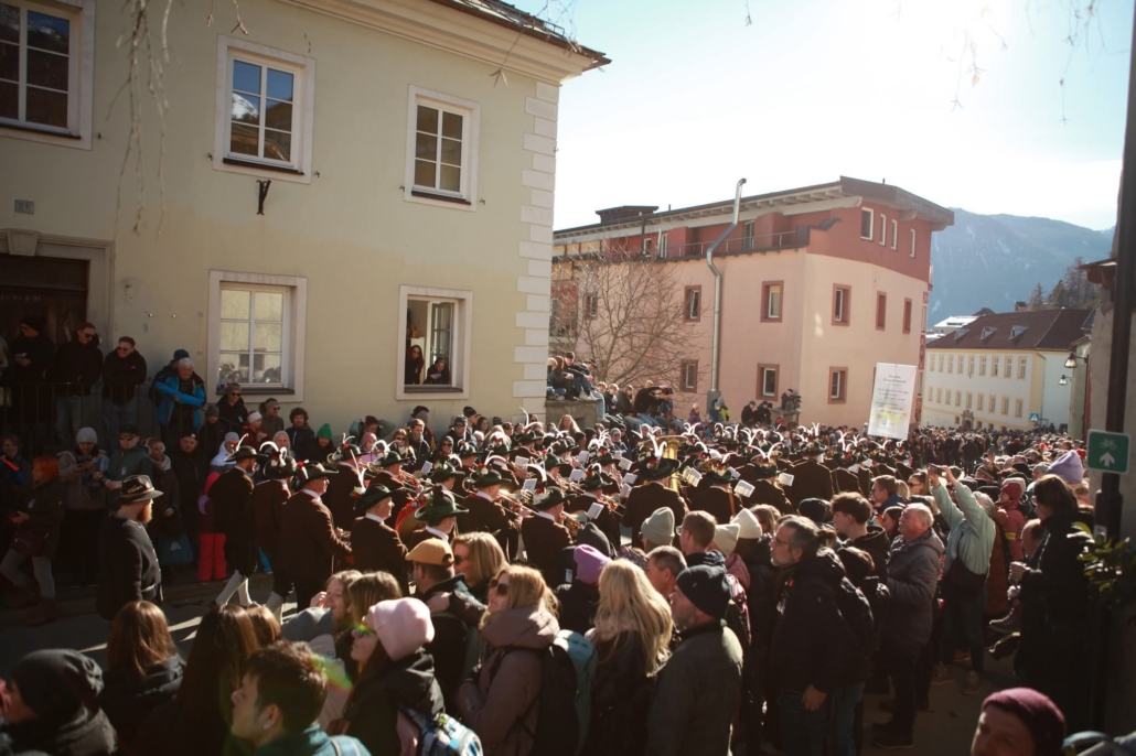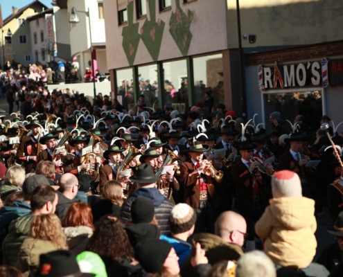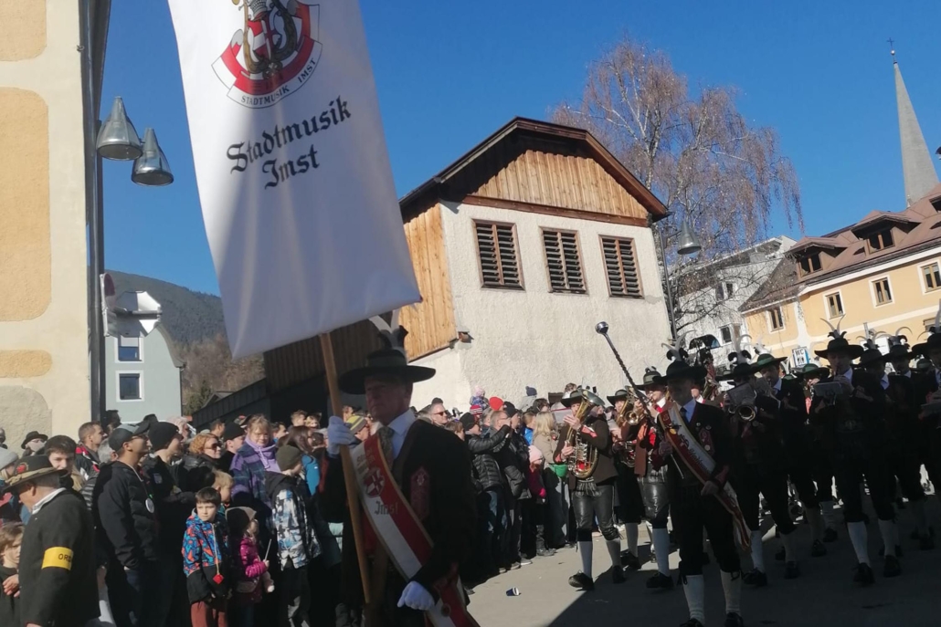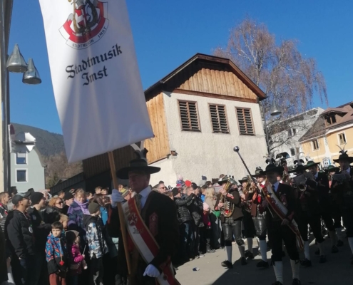 Auch wir, die Stadtmusik Imst, durften wieder aktiv dabei sein und diesen besonderen Tag musikalisch umrahmen. Pünktlich nach dem Zwölfeläuten spielten wir den Fasnachtsmarsch und eröffneten somit den Umzug. Bis hinunter zum Stadtplatz zogen wir gemeinsam mit den rund 250 beteiligten Buaben.